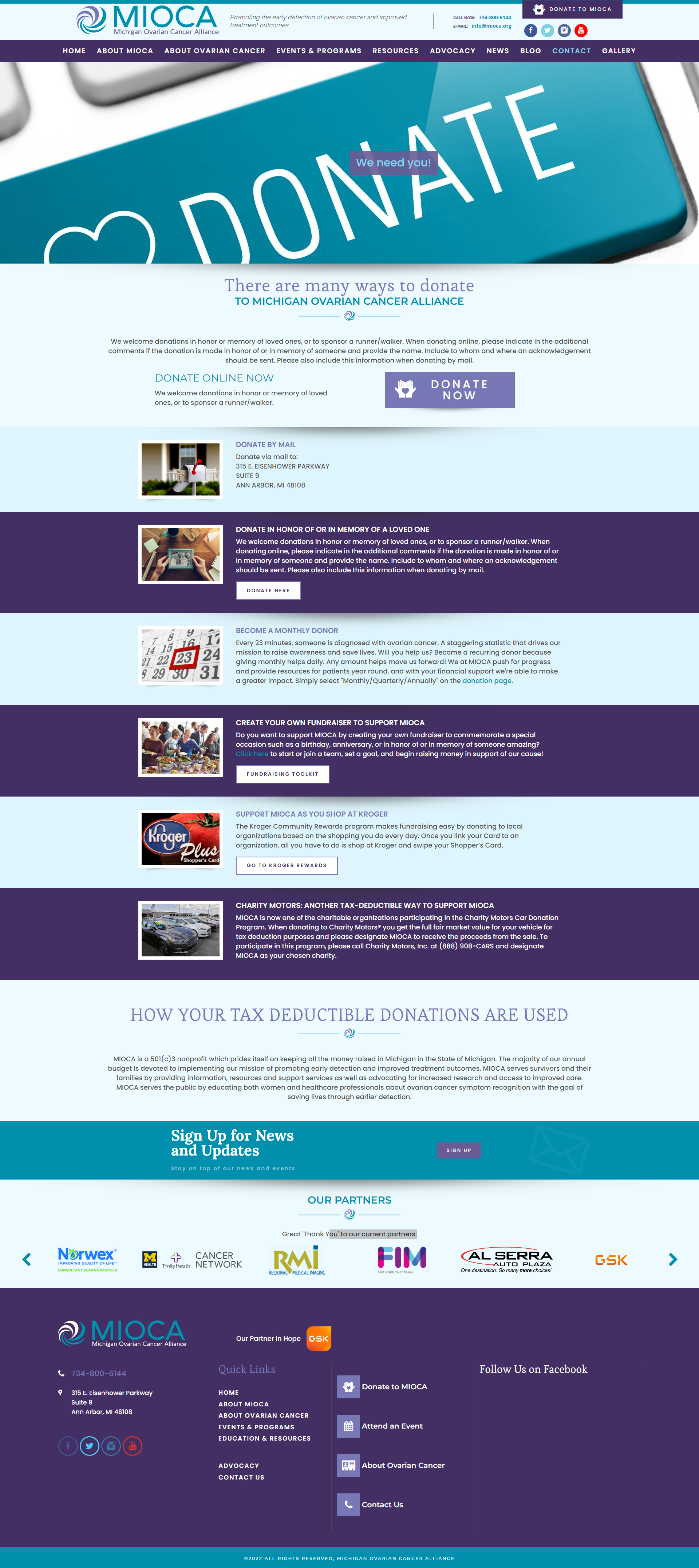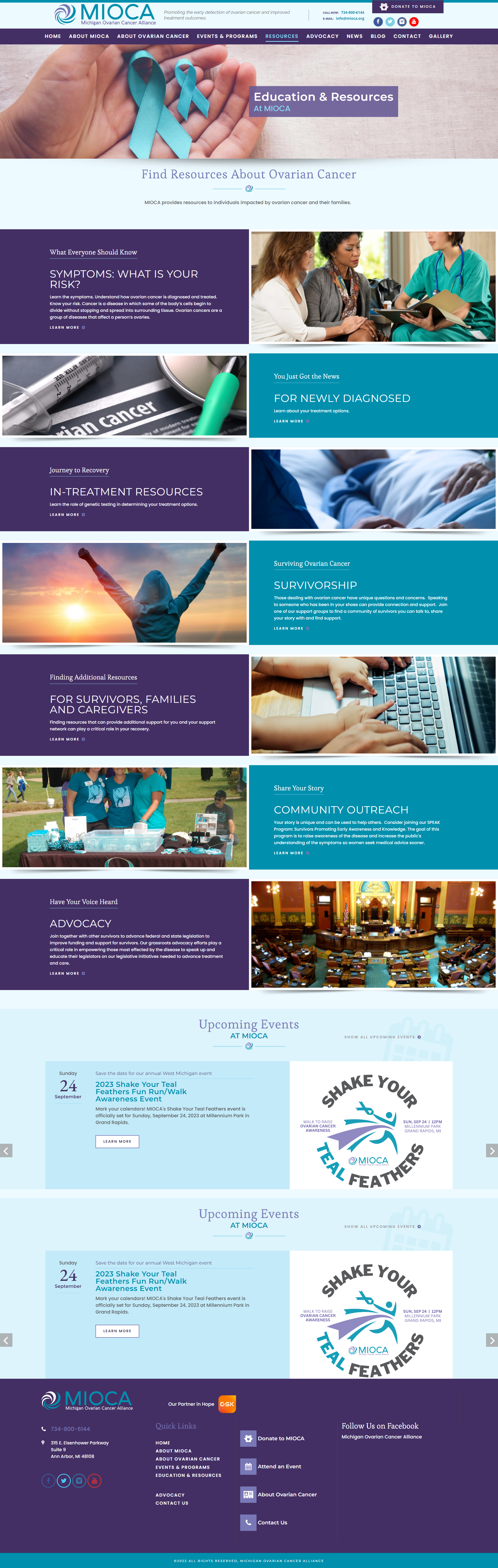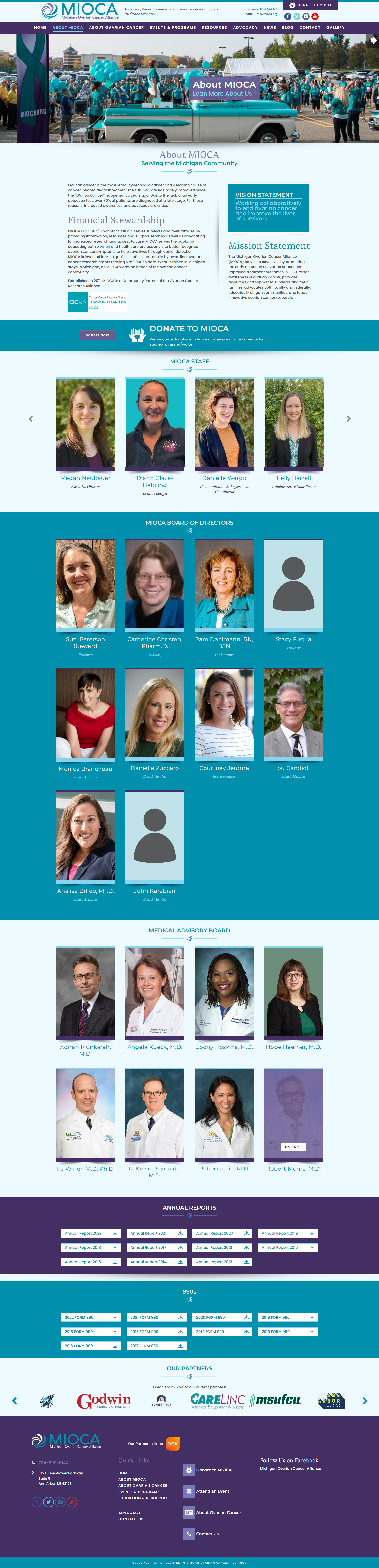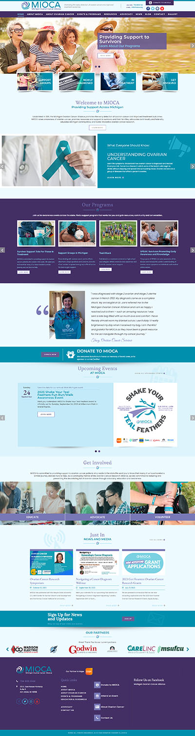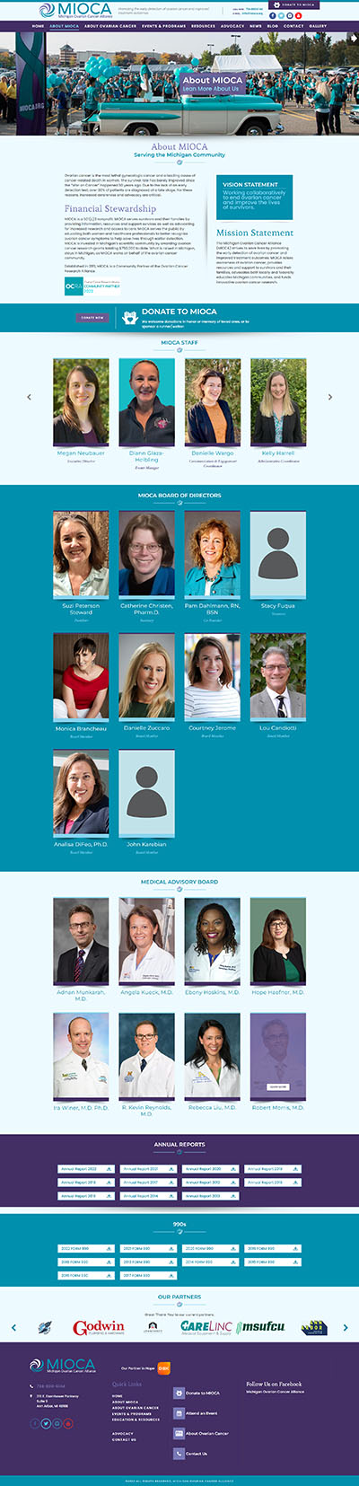 Фонд Michigan Ovarian Cancer Alliance (MIOCA) обучает женщин и медицинских работников лучше распознавать симптомы рака яичников, чтобы помочь спасти жизни за счет раннего обнаружения. MIOCA инвестирует средства фонда в научное сообщество Мичигана, награждая грантами за исследования в области рака. На момент запуска сайта (2021-й год), сумма выданных грантов составляла более $750 000.