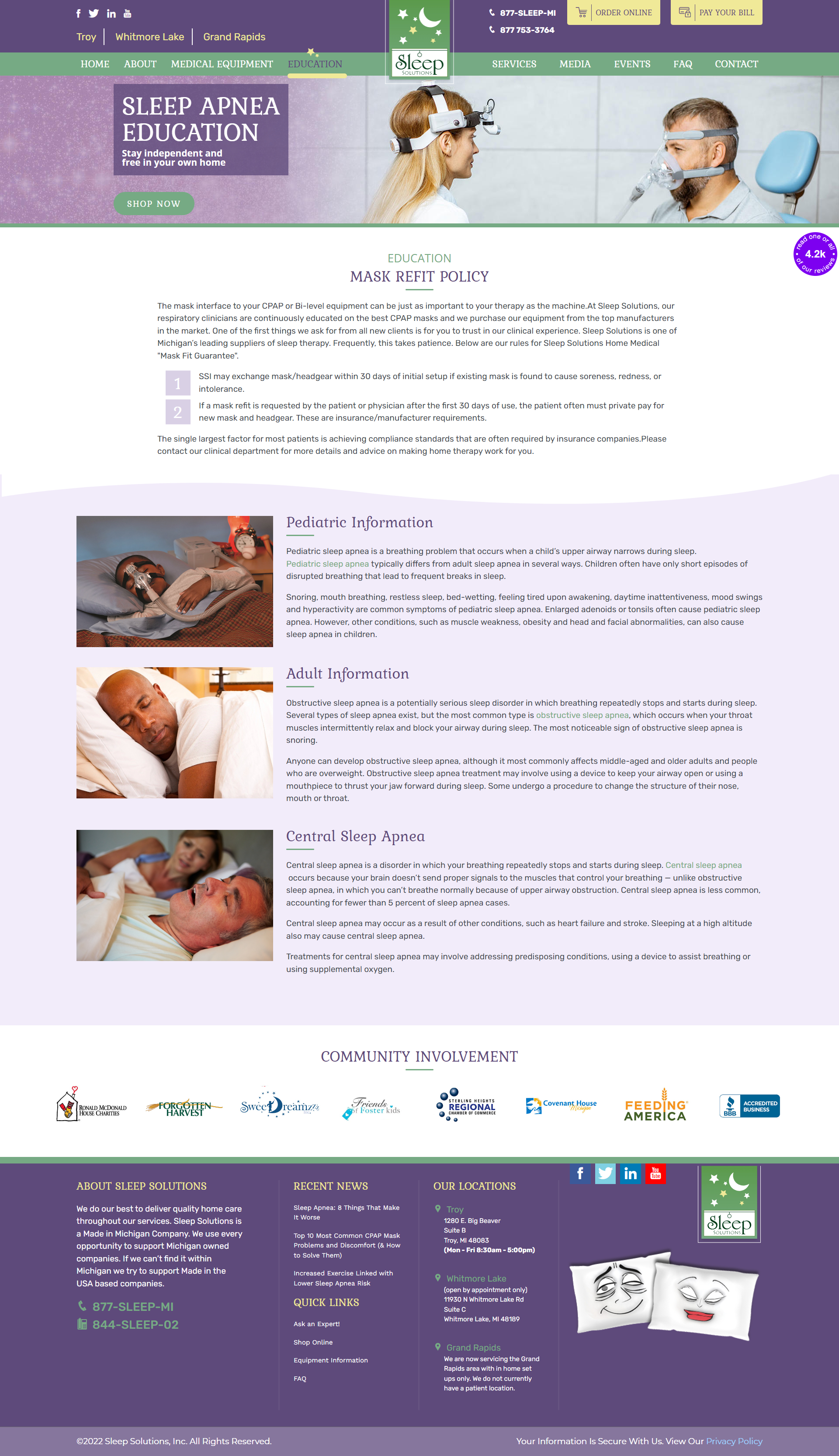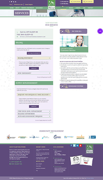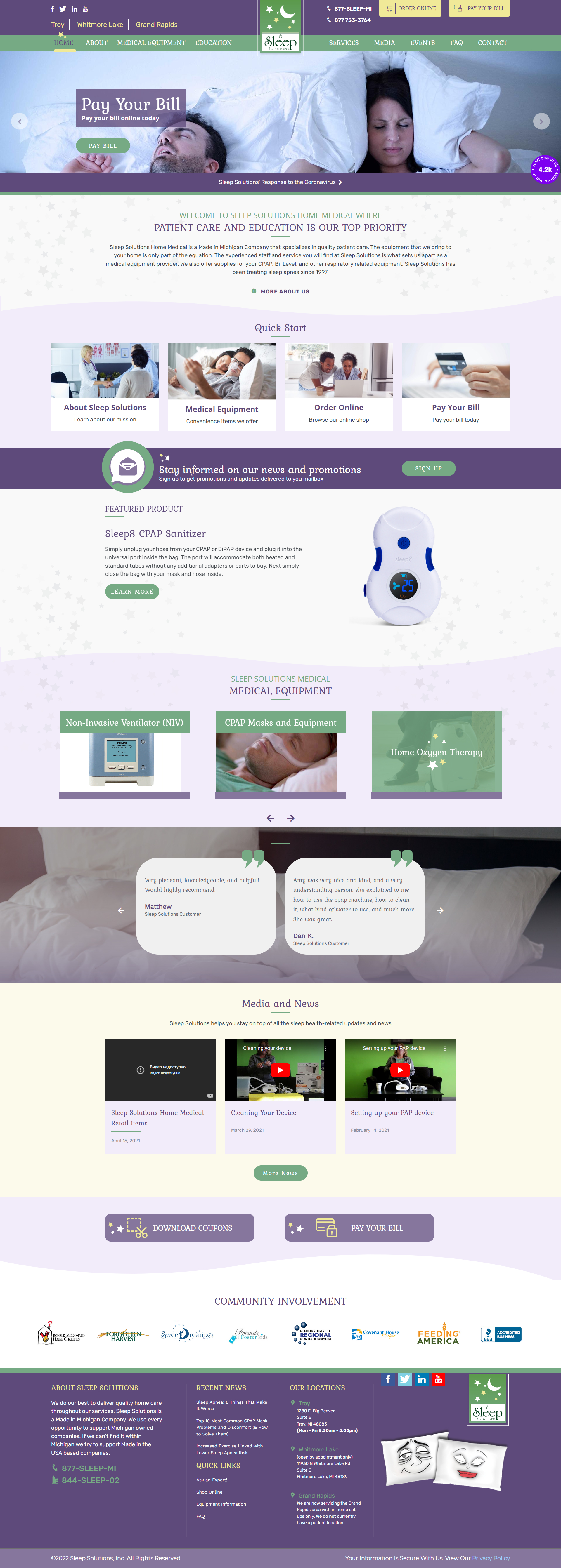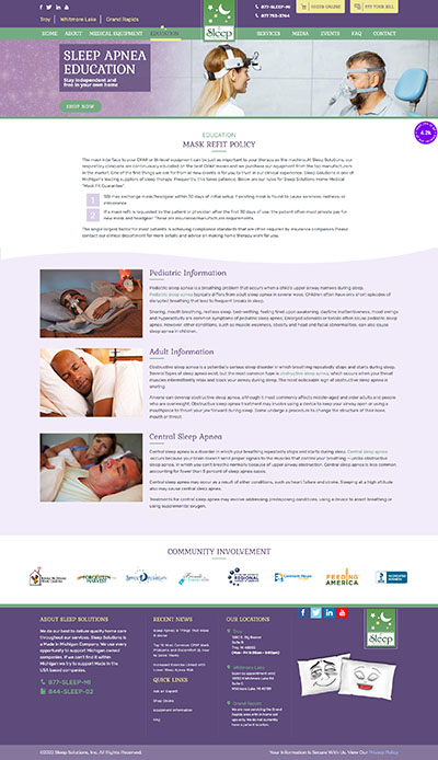 Сайт для компании Sleep Solutions Home Medical, которая оказывает помощь взрослым и детям, старающим апноэ. Помимо поставок медицинского оборудования, Sleep Solutions предлагает расходные материалы для устройств CPAP, BI-Level и другого респираторного оборудования. Компания Sleep Solutions занимается лечением апноэ с 1997 года.