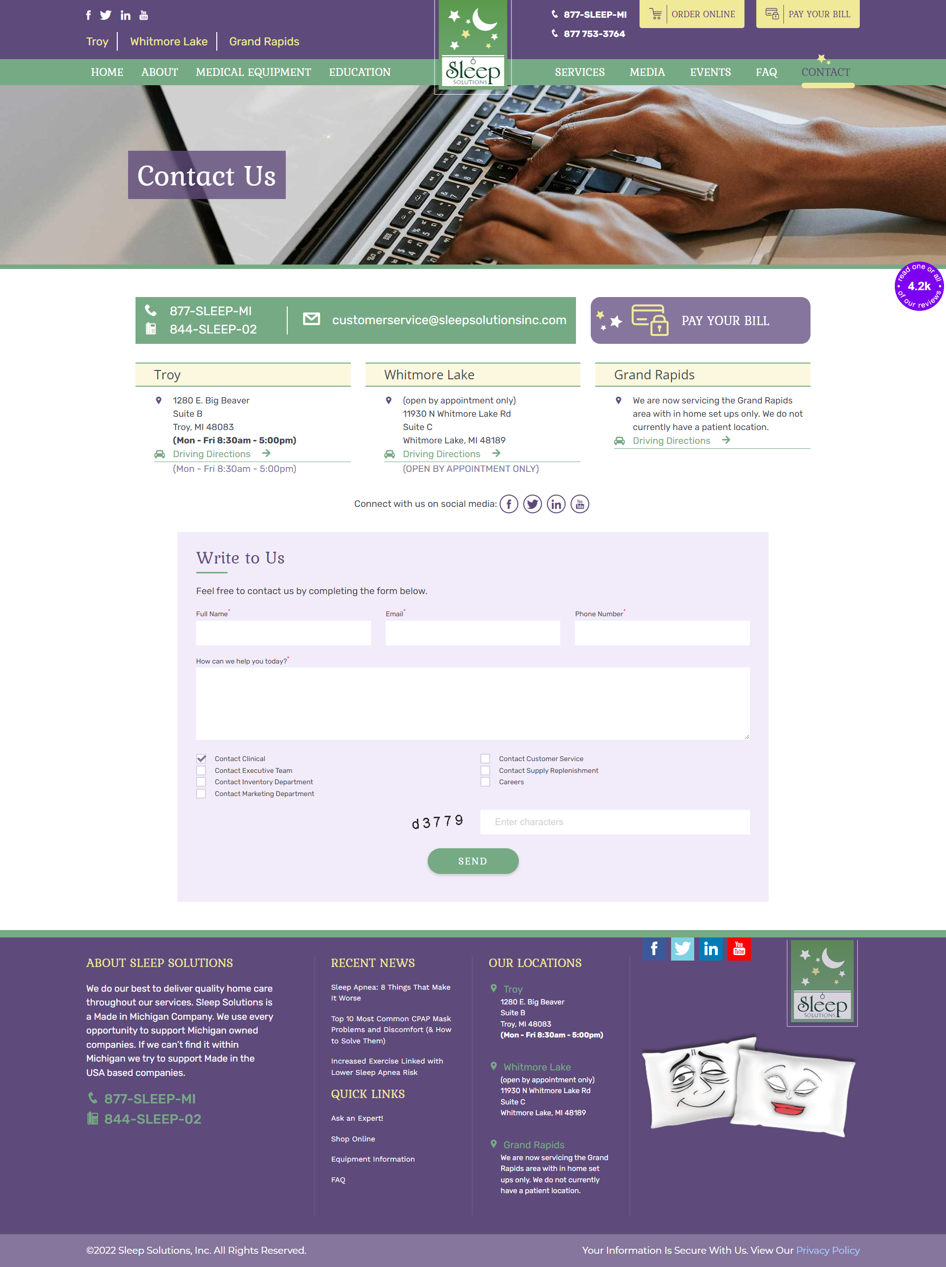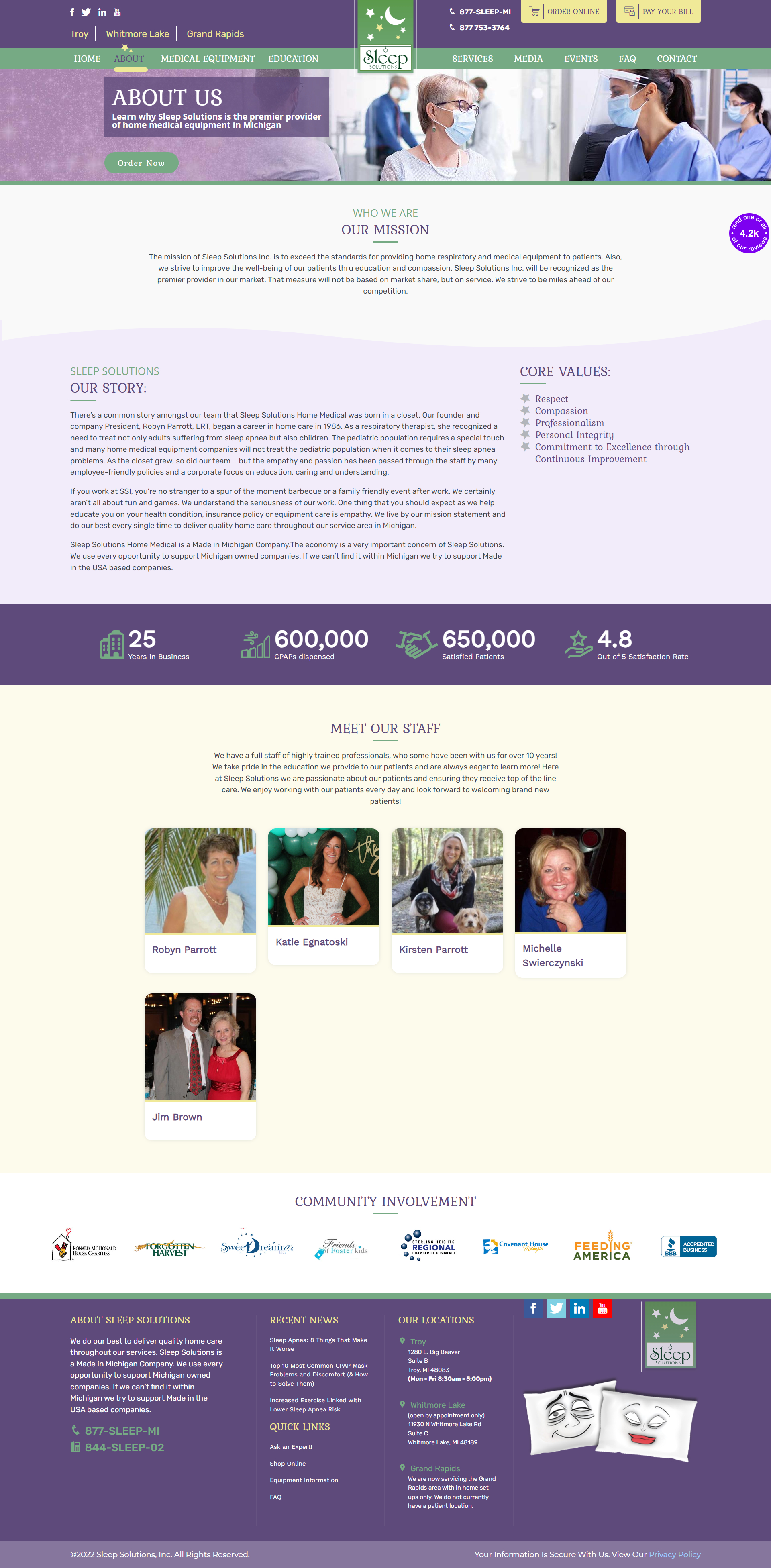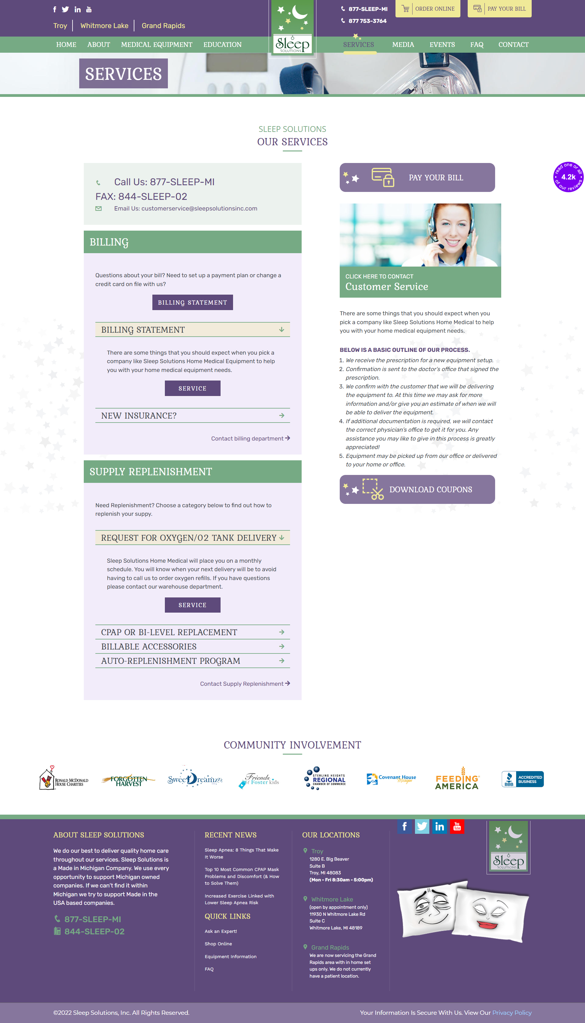 Сайт для компании Sleep Solutions Home Medical, которая оказывает помощь взрослым и детям, старающим апноэ. Помимо поставок медицинского оборудования, Sleep Solutions предлагает расходные материалы для устройств CPAP, BI-Level и другого респираторного оборудования. Компания Sleep Solutions занимается лечением апноэ с 1997 года.